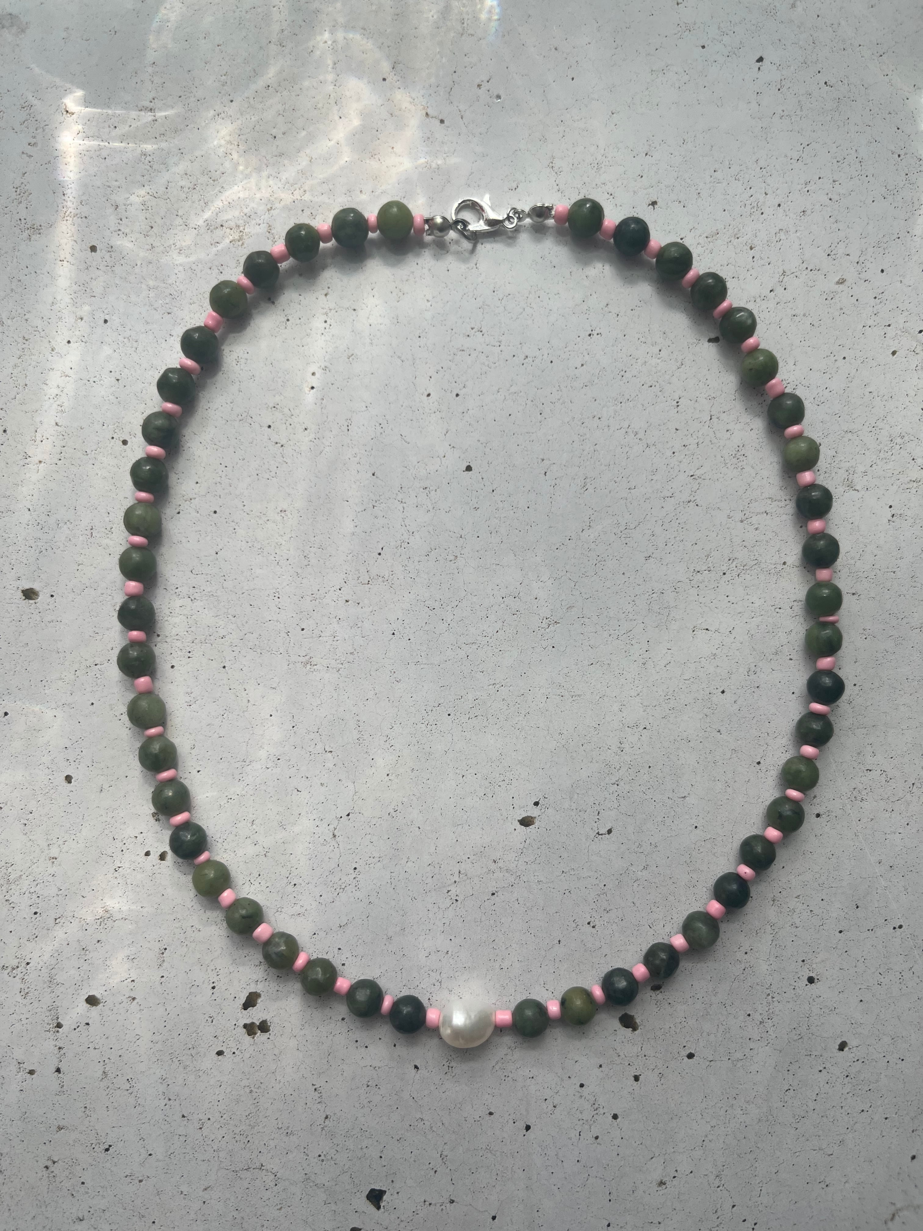 グリーンジェイドのラウンドビーズで作ったネックレス✨淡水パールがポイント♡