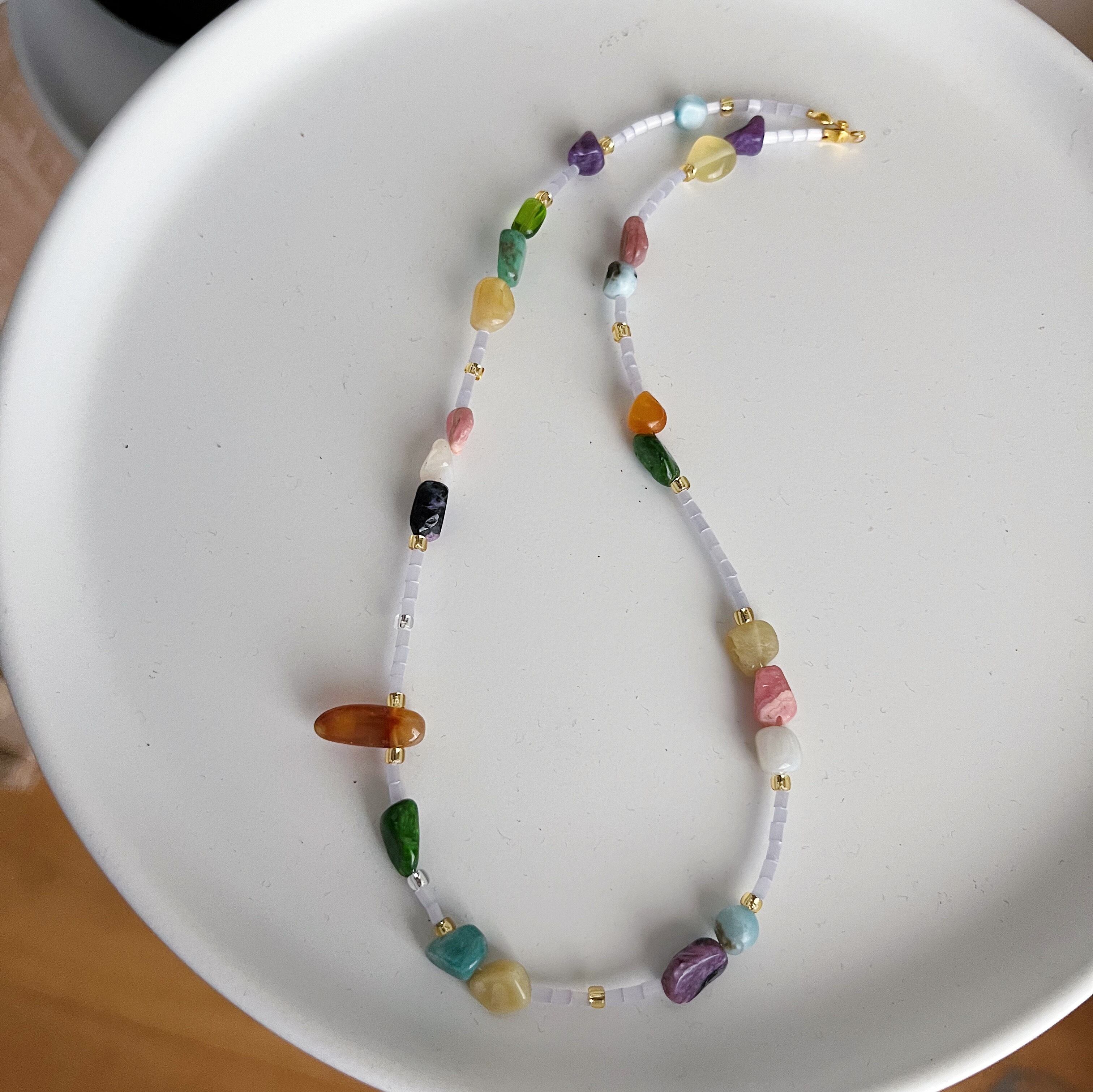 カラフルなビーズと天然石で仕上げたネックレスです❤︎(ベースのビーズはうすい紫色です!)