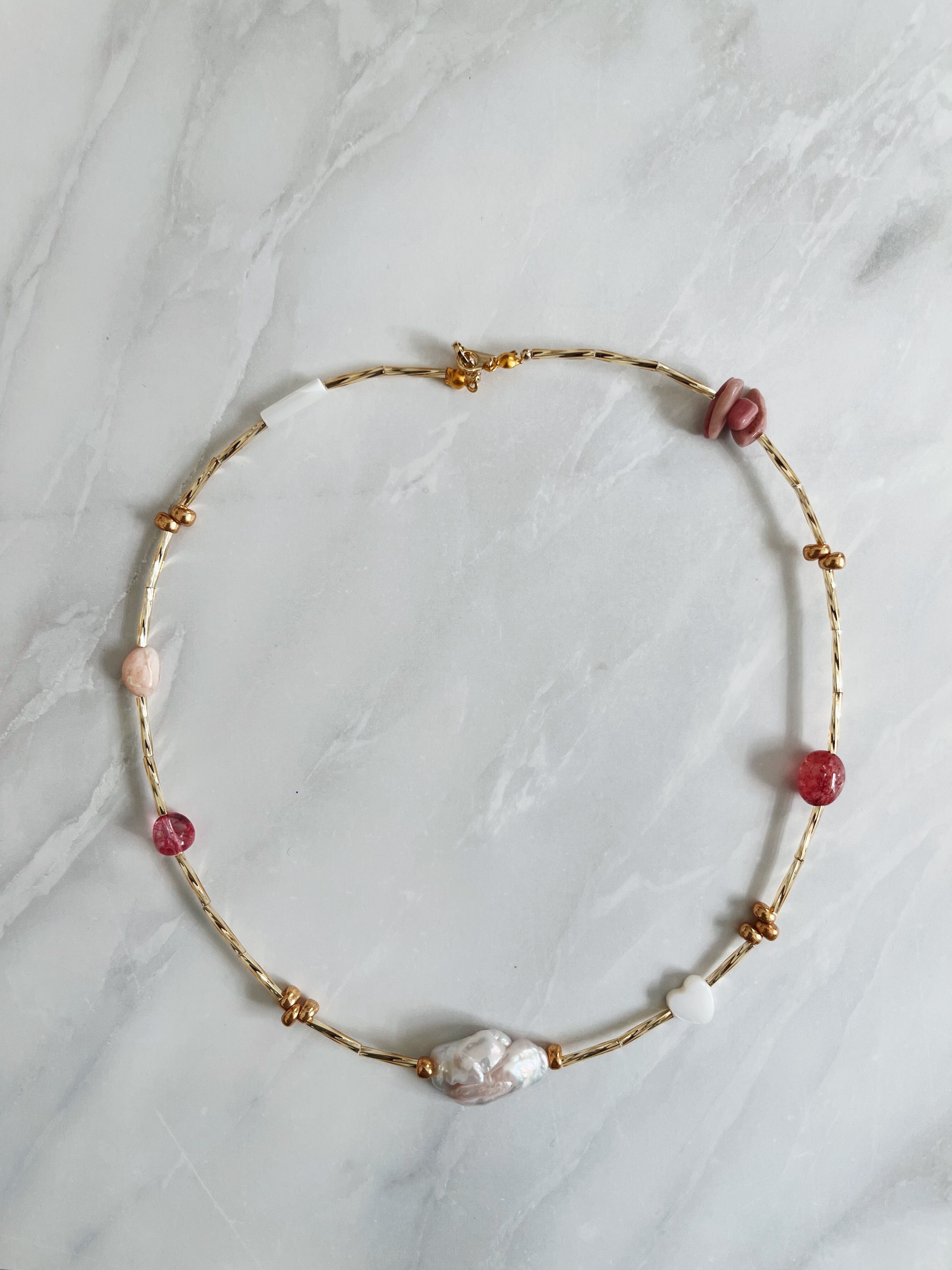 ゴールドベースにピンク系の天然石/ビーズを使って仕上げました✨